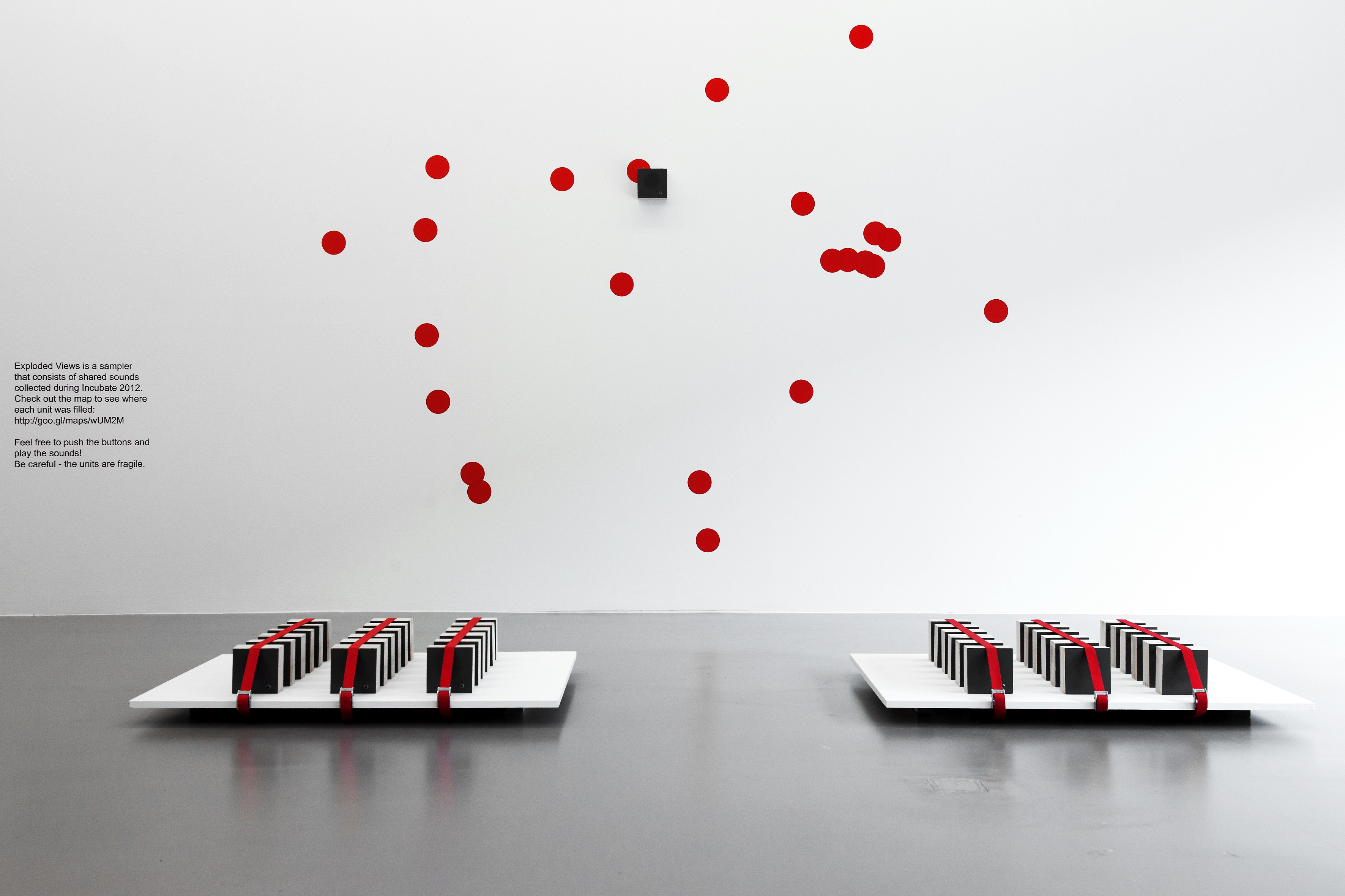 The sounds were exhibited in small wooden playback modules on a gallery wall, in geographical order to indicate their recording locations. Festival visitors were invited to play the work as if it were a big sampler of the city.